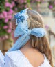 Semi capota de mibre con lazo de tul y flores disecadas en tono azul y celeste con hojas blancas